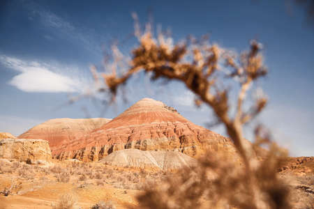 Landscape of Red with stripe bizarre layered mountains in canyon in beautiful desert park with dry plant at foreground