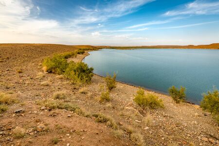 Beautiful summer steppe landscape and lake Ayr, located in stone mountains