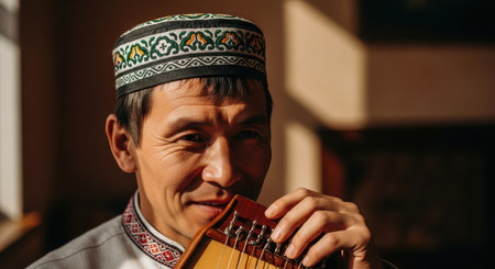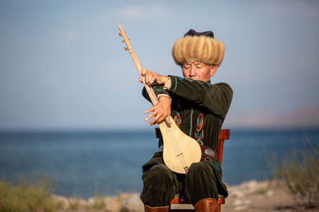 Kyrgyz musician playing traditional musical instrument known as Komuz in Issyk Kul, Kyrgyzstan