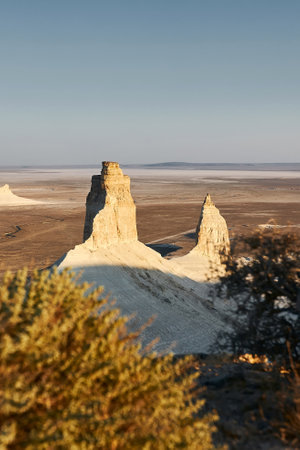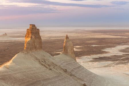 Sunrise over Ustyurt Plateau. District of Boszhir. The bottom of a dry ocean Tethys. Kazakhstan. selective focus