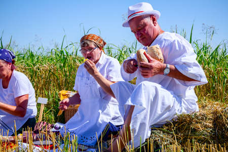 Muzlja, Vojvodina, Serbia, - July 06, 2019; Male hands are slicing homemade bread at harvest time. People are having breakfast at traditional wheat harvest.