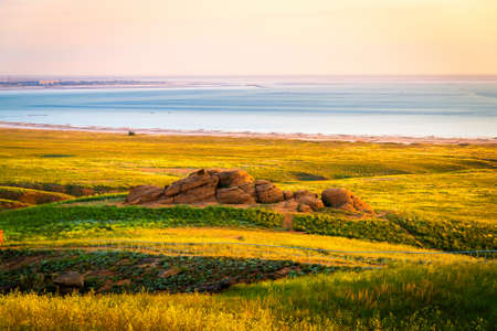 Green hills, steppe, coast of saline lake under a hot summer sun.