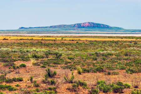 Unusual landscape. Mountain Big Bogdo in the Astrakhan region, Russia. Sacred place for practicing Buddhism. The only unique natural elevation among the steppe areas of the Caspian lowland.