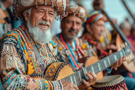 A group of musicians playing guitars, drums, and other string instruments in a band. The guitarists are strumming folk instruments with their string instrument accessories and beards