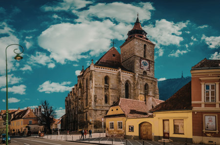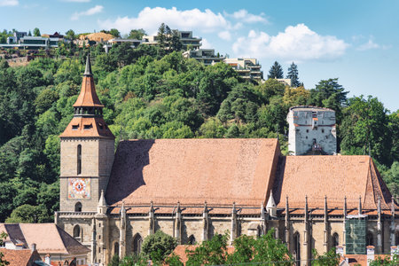 Aerial view with The black church (Biserica Neagra) located in the center of Brasov. Famous tourist attraction.