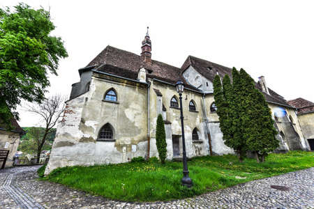 The Catholic church in citadel of Sighisoara built in an eclectic style inspired by Italian architecture with decorative arches,Roman rosettes,bell tower and exterior plaster with embossed rectangles