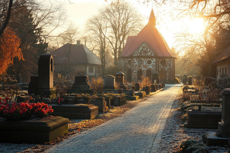Golden light from the rising sun illuminates a cobblestone path leading to a chapel in a cemetery on a cold autumn morning