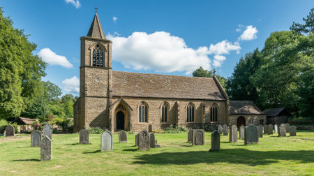 A historic church stands in a quaint graveyard surrounded by lush greenery, showcasing a peaceful landscape under a bright blue sky with fluffy clouds.