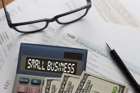 Business concept. Layout of fake money, color papers, calculator, pencil and text small business