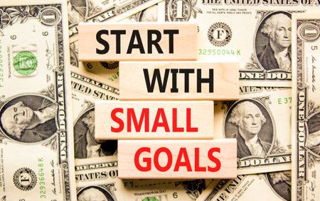 Start with small goals symbol. Concept words phrase Start with small goals on beautiful blocks. Dollar bills. Beautiful dollar bills background. Business Start with small goals concept. Copy space