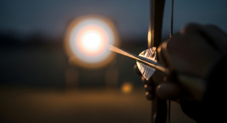 A close-up, first-person perspective of an archer aiming an arrow at a glowing target in the dark. The sharp focus on the arrow's fletching with the bullseye blurred in the background perfectly illustrates the concepts of focus, precision, and aiming for a goal. The scene is lit by the target, creating a dramatic and determined mood.