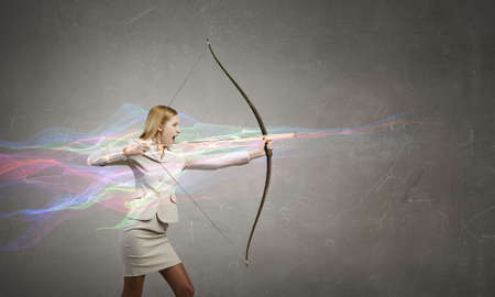 Young girl with long hair and brown eyes, she is shooting with a bow and arrow in her hand