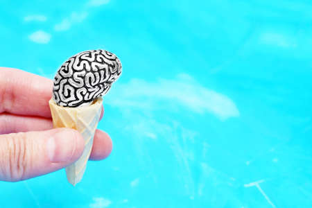 Hand holding a miniature anatomical copy of a human brain in a waffle cone imitating an ice cream. Creative mind refreshment concept.