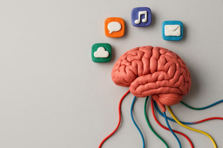 A brain made of plasticine, connected to colored wires and app icons. Space for text