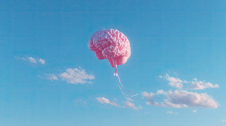 A whimsical pink brain balloon floats against a clear blue sky, surrounded by soft white clouds. This imaginative concept symbolizes creativity, freedom, and the power of ideas.