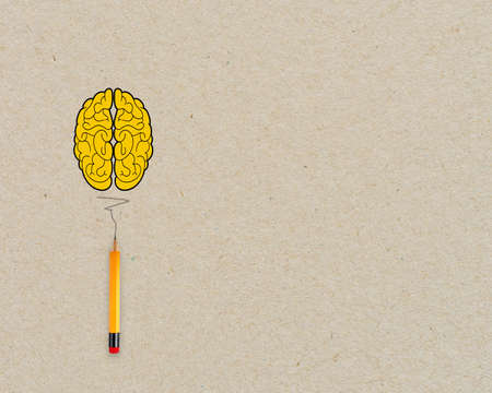Yellow brain light bulb metaphor for idea with pencil on brown recycled background