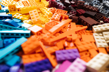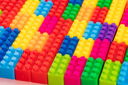 texture of colored toy bricks background. soft focus, top view.