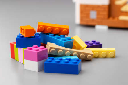 Moscow, RF, 04.09.2019: Plastic building blocks on a white background. Multi-colored cubes LEGO for children. White background