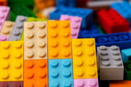 2021: Lego constructor colorful blocks, closeup abstraction