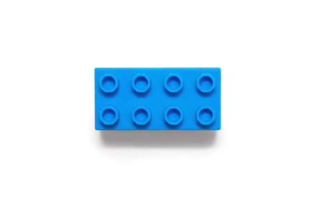Blue plastic detail on a white background. One detail of the constructor is isolated on a white background in the center of the frame