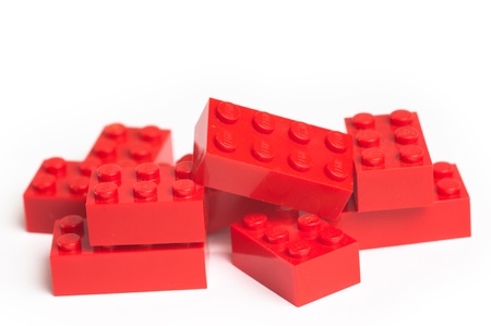 Plastic building blocks on red background
