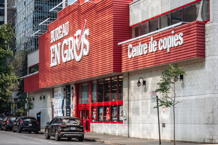 Montreal, Canada – August 14, 2025: A street view of the Bureau en Gros store in downtown Montreal with pedestrians walking past the entrance