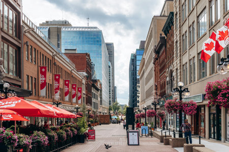 Ottawa, Canada - August 13, 2025: Pedestrian view of Sparks Street in downtown Ottawa with historic buildings, cafes, flowers, and people walking in summer