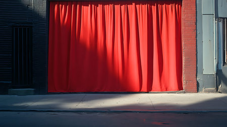 A striking red curtain on an urban street invites curiosity and artistic interpretation.