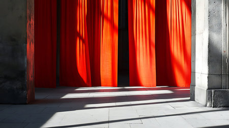 A striking interplay of light and shadow as red curtains frame a minimalist urban gallery.