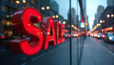 A large red sale sign is displayed on a city street, reflected in a glass window as lights blur in the background. The scene captures the excitement of shopping during a sale event.