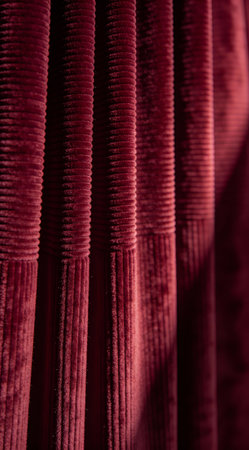 A creative digital illustration depicting Elegant creative rendering of deep burgundy corduroy ridges, vertical ribbed surface, side shadow play, textured comfort luxury, rich cord tones, commercial style. This AI-generated artwork features unique visual elements suitable for various commercial and editorial applications. AI-generated illustration.