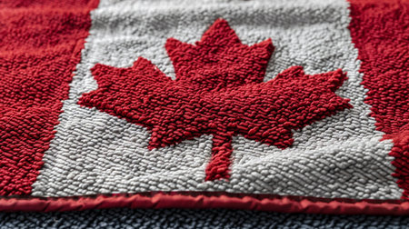 A detailed close-up view of a textured Canadian flag featuring the iconic red maple leaf, showcasing the fabric's intricate pattern.