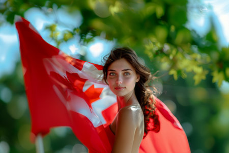 A girl with a Canadian flag on the background of a summer landscape. Happy Canada Day greeting card.