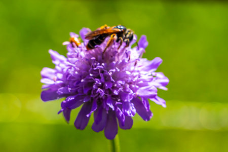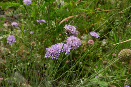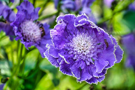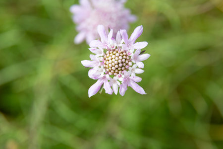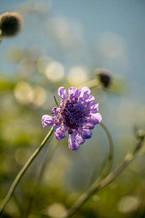 Field scabious Knautia arvensis flowering in meadow. Blue purple wild flower on natural background. Macro. Selective focus.