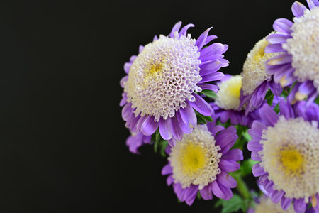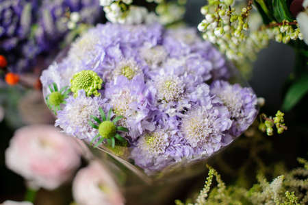 Beautiful bouquet of the purple golden-daisy in the transparent wrapping paper