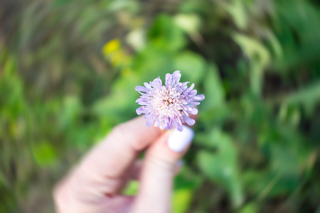One lilac field flower Scabiosa Pincushion Flower in female hand with green grass radial blur background. Wildflowers texture. Close up of Scabiosa Butterfly Blue called Pincushion flower or Scabious