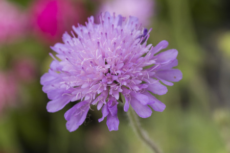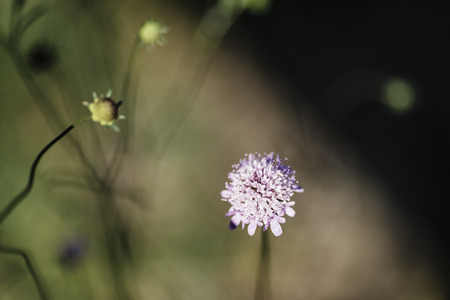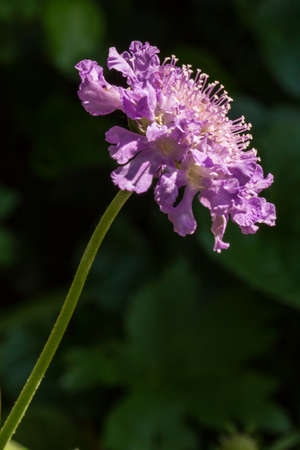 Single pink purple Scabiosa flower against a bokeh dark green background, Scabiosa is a genus in the honeysuckle family (Caprifoliaceae) of flowering plants.