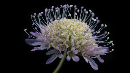 A stunning pincushion flower stands out against a dark background, revealing its unique beauty.