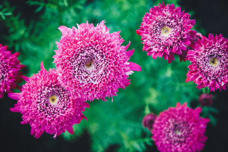 Pyrethrum hybridum flore plena rosea pink flowers in the garden, overhead view