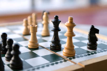 Close up view chess board with chess wooden pieces.