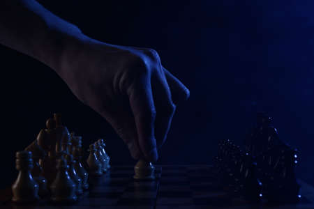 Chess game, check or checkmate, cut a figure, the concept of competition in business. player's hand moves the piece