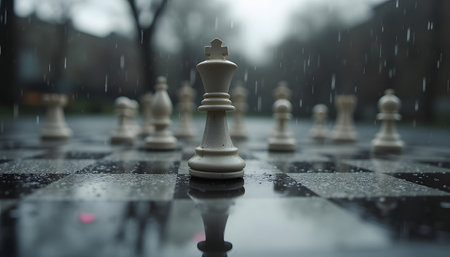 A chess king stands tall on a chessboard with other pieces during rainfall, creating a reflective surface ideal for strategic thinking.