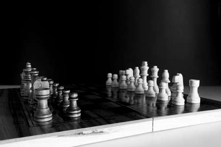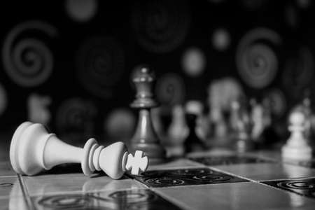 Chess game with board and chess pieces. Selective color focus and B&W chessboard.
