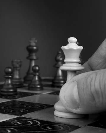 Playing Chess. Hand of a male chess player moving the white chess piece.