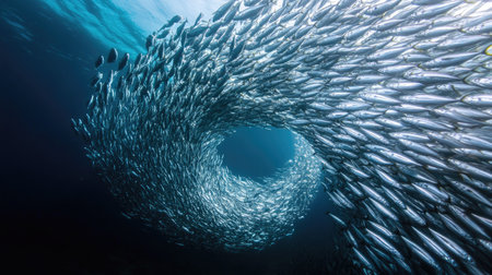 A massive school of sardines forming a swirling tornado shape as they move in harmony.