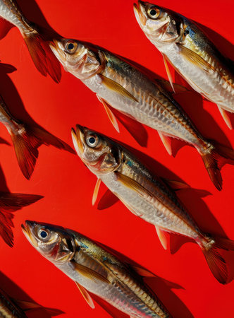 Fresh fish arranged in a pattern on a vibrant red background, showcasing their glimmering scales and natural forms, creating a dynamic visual appeal