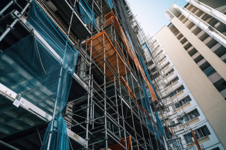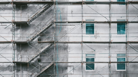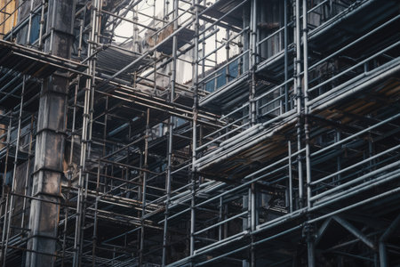 Scaffolding surrounds an unfinished building, revealing layers of construction materials and urban architecture. A glimpse into the renovation process in a cityscape setting.