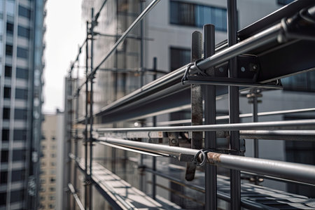 close-up of metal rungs on scaffolding, with view of modern office building in the background, created with generative ai