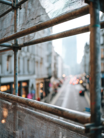 Scaffolding and protective netting surround an urban street while activities continue in the blurred background amidst city life.