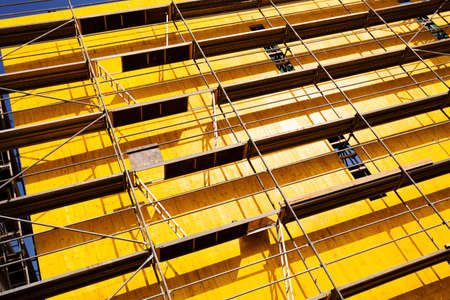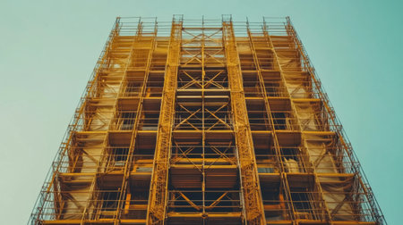 The image showcases an intricate scaffolding structure painted in yellow, emphasizing safety and organization at a construction site. The wooden flooring provides stability.